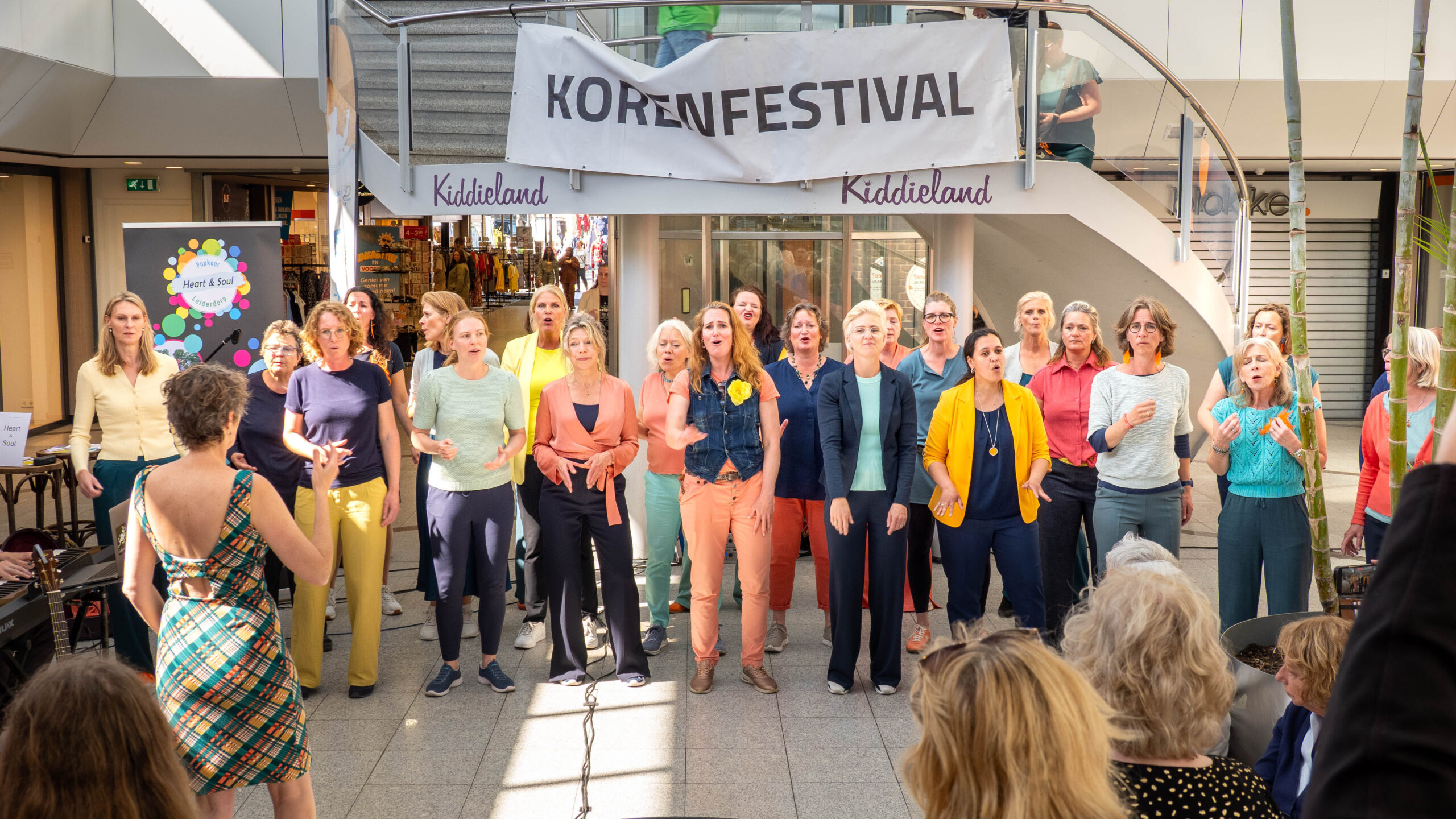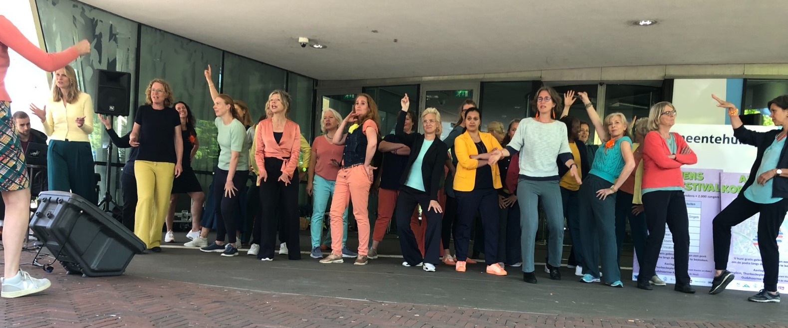 Wat fantastisch de filmopnames van het Alphens Korenfestival. Een fris programma met goede begeleiding van piano, gitaar en blaaspijp/mondharmonica. Leuke afleiding en even laten horen dat er behalve de pianist Dax, alleen dames het koor bevrouwen. Helemaal niks mis mee om van onszelf te houden of “What happens when a woman” even stevig neer te zetten. Ben je dan feminist? Ik denk dat je dan gewoon aangeeft waar de grens ligt en waar je voor staat. Wat mij betreft niks mis mee. Hou dit vast. Hebben jullie gelet op de jurk van Marlous, fantastisch, ik hoop dat zij kleedgeld krijgt. Trouwens het pak van Michèle en de kleur van de broek van Mirjam zijn ook een vermelding waard (ik ben van origine bas!). Verder wil ik mij niet als kledingdeskundige opwerpen maar ik moet toegeven dat het totale plaatje top was. Ik begreep dat het drankje aan de Rijn in Alphen ook goed bevallen is op deze mooie zomerse en hele zonnige dag!